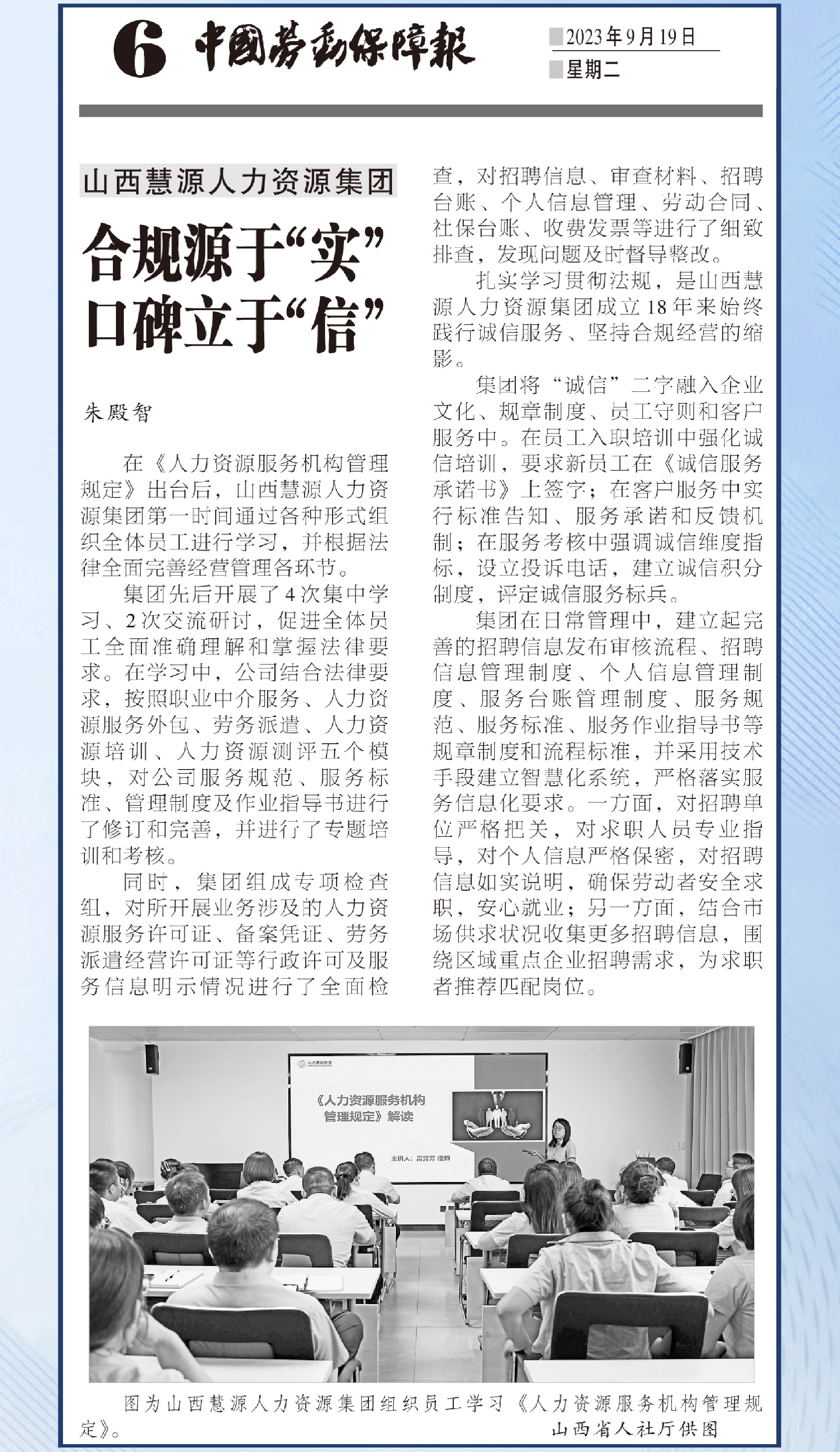 我司《合規源于“實”口碑立于“信”》于中國勞動保障報第六版刊登