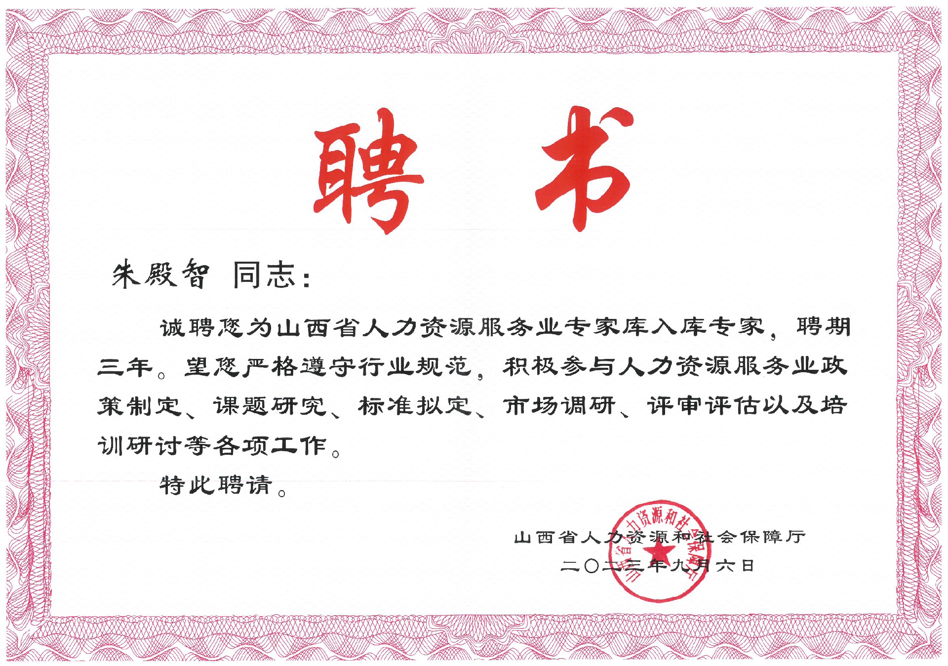 我司董事長朱殿智被聘為山西省人力資源服務業專家庫入庫專家