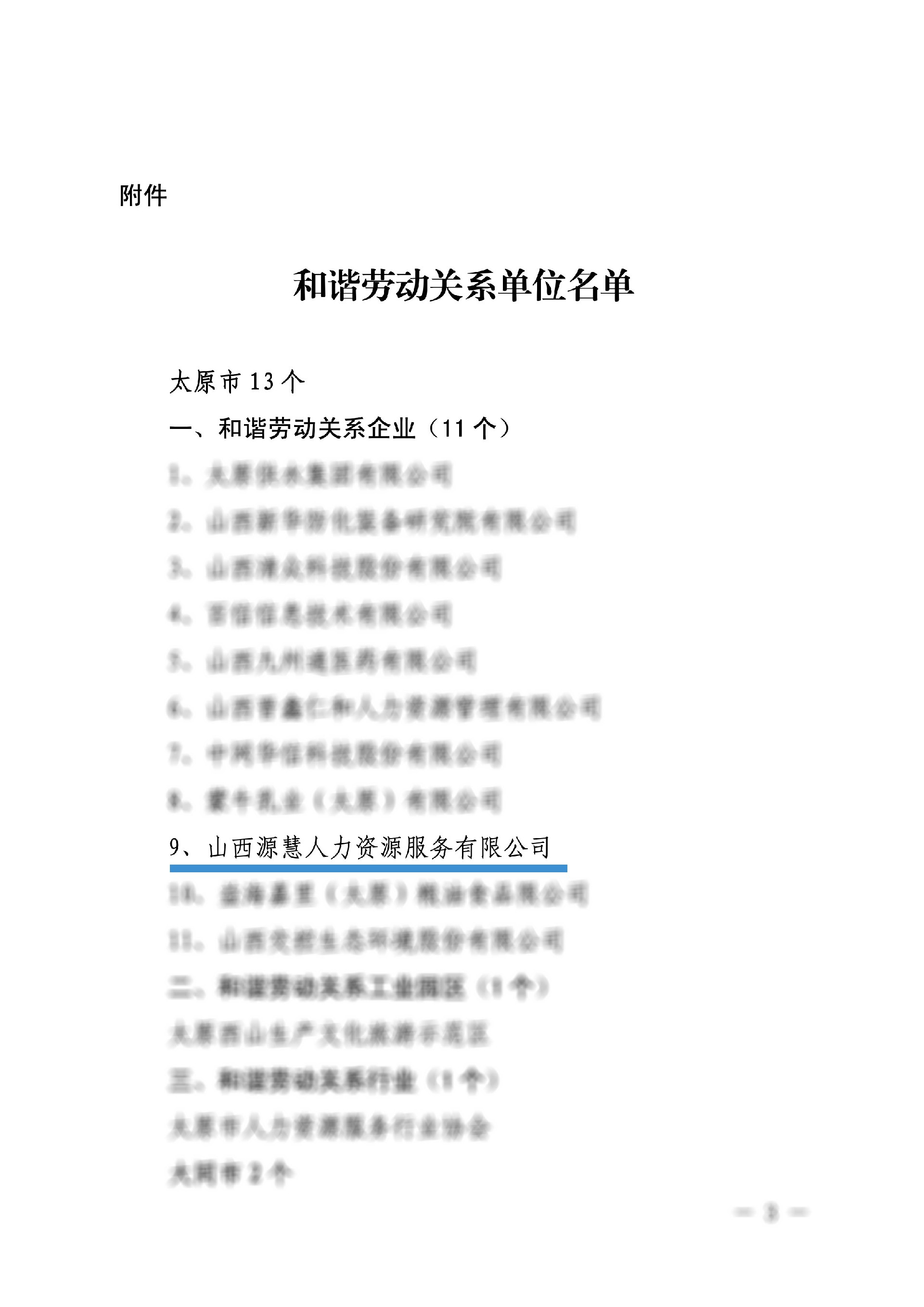 近日,山西(xi)省人力資源(yuan)和(he)社會保障廳發布(bu)《關(guan)于(yu)和(he)諧(xie)勞(lao)動關(guan)系(xi)單位的(de)通報》,山西(xi)源(yuan)慧人力資源(yuan)服務有限公司憑借在構建和(he)諧(xie)勞(lao)動關(guan)系(xi)方面的(de)卓越表(biao)現,被(bei)評為(wei)“和(he)諧(xie)勞(lao)動關(guan)系(xi)企(qi)業(ye)(ye) ”。這一榮譽(yu)不僅是(shi)對(dui)源(yuan)慧人力多年來堅持以人為(wei)本(ben)、積極營造(zao)良好用(yong)工環境的(de)高度認可,也是(shi)對(dui)公司在推動行業(ye)(ye)和(he)諧(xie)發展中所發揮(hui)示(shi)范作用(yong)的(de)充分肯(ken)定。